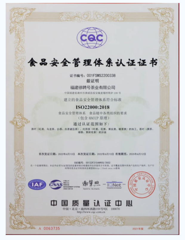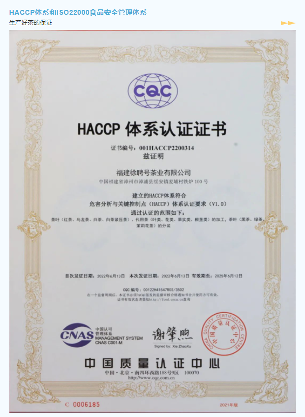 HACCP和ISO22000体系认证证书就是对一款好茶的安全背书。